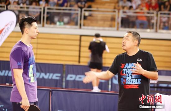 5月22日,中国乒乓球队在卢森堡备战即将举行的世乒赛。图为主教练刘国梁(右)在给男队主力马龙指导。中新社记者 沈晨 摄