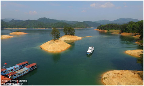 2017年5月20日,在江西省赣州市上犹县陡水湖景区,一艘游船行驶在碧波荡漾的湖面。近年来,上犹县开展库区综合治理行动,良好的生态环境,有力助推了生态旅游产业发展。(钟芳亿摄/人民图片)