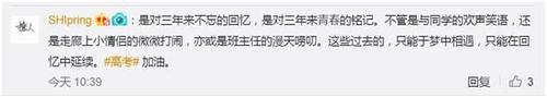 “是对三年来不忘的回忆,是对三年来青春的铭记。不管是与同学的欢声笑语,还是走廊上小情侣的微微打闹,亦或是班主任的漫天唠叨。这些过去的,只能于梦中相遇,只能在回忆中延续。高考加油?!?/p>