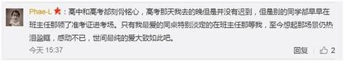 “高中和高考都刻骨铭心,高考那天我去的晚但是并没有迟到,但是别的同学都早早在班主任那领了准考证进考场。只有我最爱的同桌特别淡定的在班主任那等我,至今想起那场景仍热泪盈眶,感动不已,世间最纯的爱大致如此吧?!?/p>
