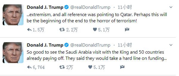 美媒称,特朗普在推特上发表一系列评论说,他最近访问沙特阿拉伯并与穆斯林国家领导人会面时指出,卡塔尔是恐怖分子的一个资金来源。他说,他与沙特国王和50个穆斯林国家元首会谈,呼吁建立团结阵线,共同打击恐怖主义,他“高兴地看到”,会谈“已经在产生效果”。