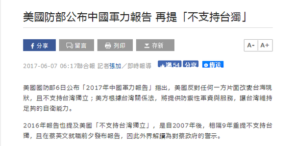与此同时,台湾《联合报》注意到,五角大楼“2017年中国军力报告”再次提及,美国反对任何一方片面改变台海现状,且“不支持台湾独立”;美方根据台湾关系法,将提供防御性军资与服务,让台湾维持足够的自卫能力。