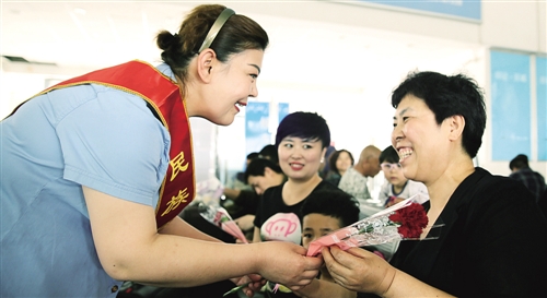 阿依加玛丽(左)为旅客带来鲜花,祝他们旅途愉快。 张砾丹摄