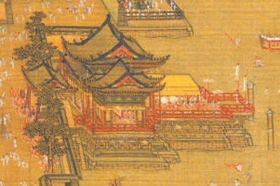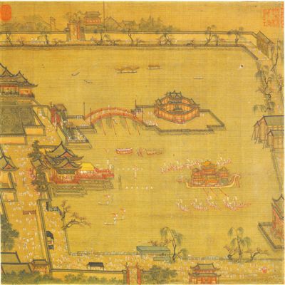 战国时期在端午节举行旨在祭奠屈原的活动,在三国时期已初步形成了龙舟竞渡的习俗。到北宋太宗朝末,朝廷将赛事前移到三月,但禁止民间从事竞渡活动,以防滋事,只是在都统司监管下由军卒表演的水上杂技和竞技运动,竞赛地点就在开封城西,那是太宗朝继后周开凿的人工湖——金明池,故当时又称“西池”“西湖”。这一切在现存最早的表现龙舟竞渡的《金明池争标图》中得到了生动的再现。