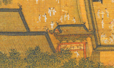 画中游园的点景人物众多,细小如蚁,画家用靓丽的矿物质颜料如朱砂、石青、石绿等和蛤粉轻轻点出人物的衣衫,用浓墨点出冠发,虽不见眉目,亦能识出儒士、禁军、乐舞队、妇女、幼童、游商等不同的人物身份,姿态个个生动,气氛热烈欢快,显然是出自一位眼神极好的年轻画家之笔。