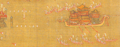南宋佚名的《金明池争标图》页,是现存最早表现龙舟竞渡的画幅,画家生动地再现了北宋开封金明池龙舟竞渡的高潮场景——众龙舟正冲向临水殿前树立的标杆。幅上有张择端款,实为后添。