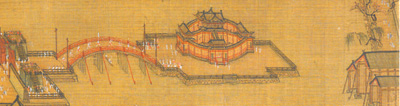 该图工整精丽的绘画风格属于典型的南宋院体,建筑布局十分写实,如画中琼林苑大门直通金明池,可知金明池是琼林苑的水上部分。宋代有“四园”之称:琼林苑、金明池、宜春园和玉津园。其中金明池和琼林苑,分别位于顺天门大街的北南两侧,在娱乐功能的使用上是一个整体。画中的建筑样式属于宋代南方的建筑形制,斗拱的密度大于唐代建筑,低于元代建筑。处于画幅中景的水心五殿、仙桥和宝津楼均符合《东京梦华录》的记载,其中的临水殿处于近景,画家描绘得更加精细:上翘的屋顶四角用木制水戗高高托起,显得十分灵巧与飞动,这是江南建筑特有的做法。画家难以见到北方建筑,只得画当时的江南建筑。