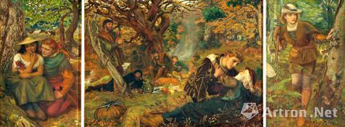 但是,相关的作品依旧是有的。亚瑟·休斯(Arthur Hughes)拉斐尔前派风格的三联画描绘的是《皆大欢喜》中的场景。不过,艺术家在这里有多维的考虑:他想要表现异装的罗瑟琳。正如这幅画的收藏机构Walker Art画廊描述的那样:“《皆大欢喜》中的场景因为故事情节而显得非常有趣,画家的主题为:变装、同性渴望和盘错的男女关系。在《皆大欢喜》中,聪明美丽的罗瑟琳将自己伪装成加尼米德,并和善良的表妹西利亚生活在一起……当罗瑟琳穿上男性服装之后,她的整个气质好像变得男性化了,性格也变得果敢而主动。这可以激起关于性别和情欲流动本质的讨论?!?/p>