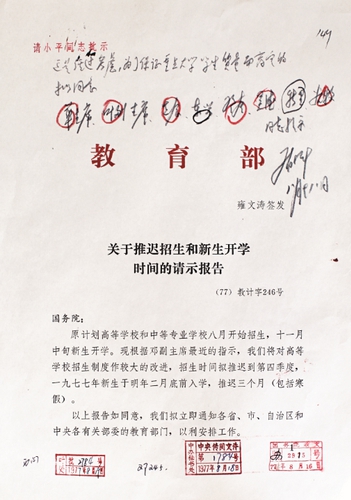 1977年,邓小平拍板推迟开学、恢复高考。教育部紧急召开当年第二次招生会。图为相关文件。(杨学为供图)