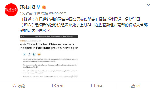 早前据《环球时报》官方微博6月8日援引路透社消息,极端组织“伊斯兰国”(IS)新闻社声称该组织杀死了上月24日在巴基斯坦西南部的俾路支省绑架的两名中国公民。