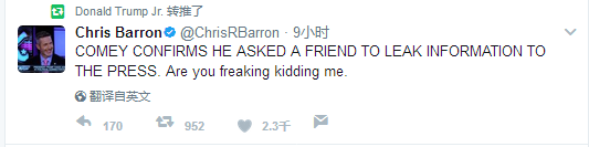 当科米谈到自己遭到特朗普开除,曾透过友人放消息给媒体,希望藉此启动特别检察官的任命。对此,小特朗普转推了克里斯·巴伦的推特:“科米刚刚讲说他请朋友代为放消息给媒体?这是在开玩笑吗?”