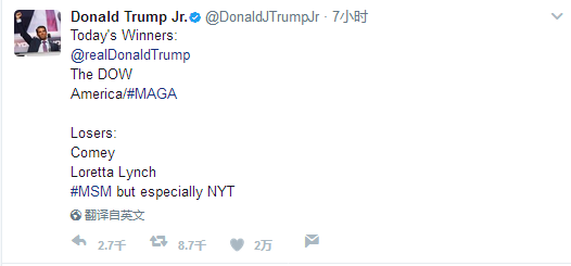 小特朗普的推文称,今天的胜利者:特朗普、道琼斯指数、美国;失败者:科米、洛蕾塔·林奇、美国主流媒体特别是纽约时报。