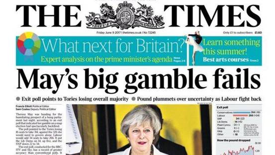据报道,对英国广播公司发布的出口民调显示,梅所在保守党未能赢得议会多数席位。这一预测表明,英国可能变成悬浮议会,没有赢家。在组建联合政府的谈判中,该国可能会陷入政治不确定性。对这一初步结果,《泰晤士报》、《金融时报》得出以惊人的论:梅的豪赌失败了。