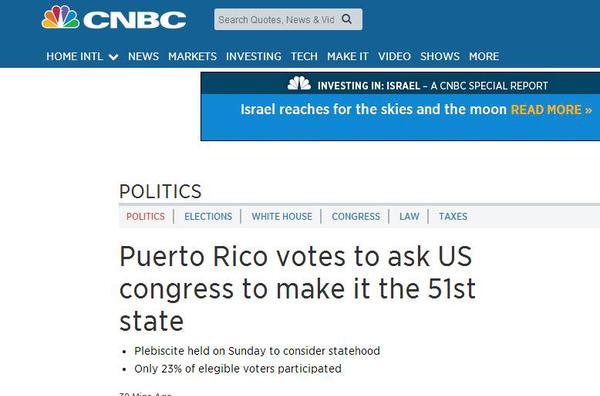 【环球网报道 记者 赵衍龙】位于加勒比海的波多黎各岛于当地时间11日就与美国之间的地位关系举行第五次全民公决。据美国全国广播公司6月11日报道,波多黎各岛公投赞成向美国国会申请“成为美国的第51个州”。