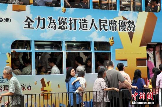 香港回归20年,中央政府推出系列措施支持香港经济金融稳定发展。2003年以来,中央政府先后推出《内地与香港关于建立更紧密经贸关系的安排》(CEPA)及系列补充协议、内地居民赴香港“个人游”、开放人民币业务、推动国企到港上市、沪港通、深港通等惠港政策,为香港经济发展提供了强劲动力。香港自1995年起连续23年获评全球最自由经济体,评分稳居第一。图为香港“叮当车”上的人民币广告。中新社记者 洪少葵 摄