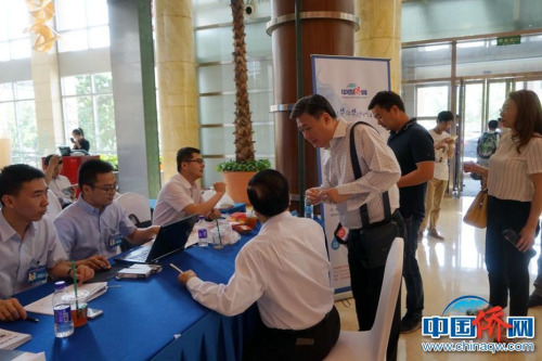 第二届华侨华人工商大会报到现场,中国新闻社“侨宝”客户端及中国侨网微信宣传品吸引了高度关注,嘉宾纷纷扫码下载。付强 摄