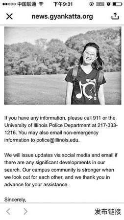 美国当地消息也肯定了这一点,根据章莹颖在UIUC的指导教授管教授称,章莹颖在9日中午左右离开实验室大楼,她计划前往位于林肯大道上的公寓签订新的租屋合约。