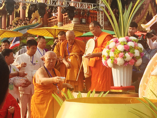 2016年2月,时隔60年,中国南传佛教再次升座帕松列。升座庆典法会上,来自东南亚、南亚的高僧大德滴水祈福。蓝希峰摄