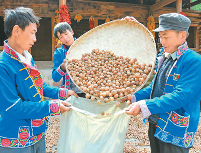 楚雄大力发展高原绿色农业。图为南华县核桃丰收,村民乐了。