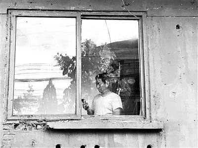 章莹颖的父亲站在窗口翻着手机,依然没有女儿的消息 摄影/实习记者 张曜麟