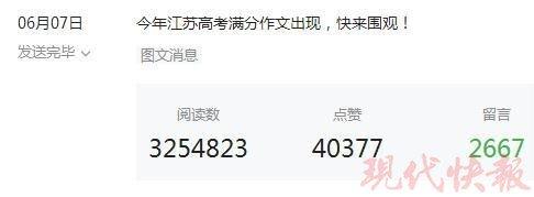 在电脑前按下鼠标,匆忙发出 " 今年江苏高考满分作文出现,快来围观 " 后,程小纯的公号后台仿佛炸了锅。这个靠写校园题材经营半年的公众号,文章阅读量此前很少超过 1000,但当晚,借着高考的热度,这篇文章直接破万。第二天上午 10 点,阅读量蹿升到 10 万。24 小时过去,数据超过到 120 万。