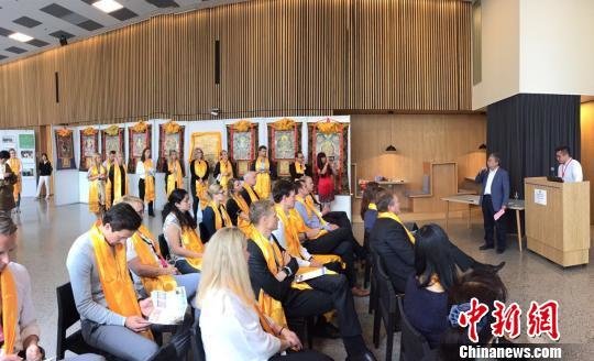 当地时间6月12日,“感知中国·大美青海”摄影、唐卡艺术展挪威首都奥斯陆世界500强的阿克集团总部开幕。图为非物质文化遗产?;ご腥讼奈峤窍蚬壅姑裰诮步馓瓶?。文飞摄