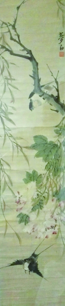 《芙蓉春燕图》,墨笔纸本高92.5厘米,宽20.05厘米。大凡传统中国花鸟画中之主象有二,动物和植物,植物之花草树木和动物中飞禽走兽在画面中都有特殊含义,此幅画作右上约三分之二处向左上角用浓淡墨斜出一枝柳树,柳树有惜别、依依不舍之意,柳树枝条下垂,与右边低垂的芙蓉遥相呼应,而芙蓉在春天开放又象征富贵吉祥。柳树的放,再由柳树枝条的收,枝条又与芙蓉形成回转之势,栖息在柳树上的燕子探头俯视画面下部,另一只燕子虽然俯冲向下,但仍有昂首向上趋势,上下两只燕子,一静一动,一呼一应,一放一收,顾盼生情,惟妙惟肖。自古以来燕子具有报春之意,即春天的使者,整幅画面设色清雅,草绿色的叶子之间穿插粗细浓淡墨线,乱中有序,用白粉画出芙蓉花的底色,浓粉线勾出花瓣,略施胭脂,浓墨点蕊如画龙点睛,彰显精气神采?;姹ヂ?,布局灵活精巧,借助春天燕子、芙蓉、柳树,表达人们珍惜美好时光,实乃梦白先生之精神向往。