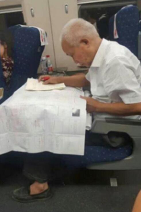 这两天,一位其貌不扬的老先生在高铁二等座上笔耕不辍的照片刷屏网络,感动无数网友。照片中,白发苍苍、脚穿旧皮鞋,专注于修改文件的老人,正是中国工程院院士、著名摄影测量与遥感专家刘先林,他今年已经78岁。网友称他为“高铁二等座最高贵乘客”,直呼“又见扫地僧”。(6月14日澎湃新闻)