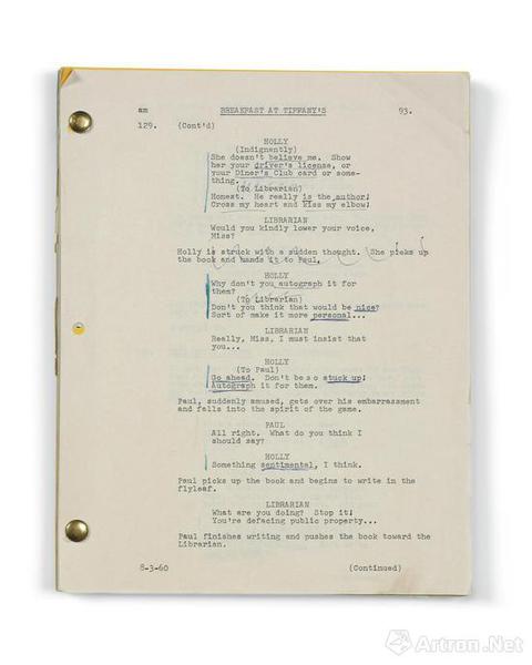 奥黛丽-赫本是少数同时夺得金像奖、艾美奖、葛莱美奖 和东尼奖的女星之一,而是次拍卖则呈献其代表作《蒂凡 尼的早餐》(估价:60,000-80,000 英镑)和 《谜中谜》(估价:15,000-25,000 英镑)的亲笔批注剧本。她经常以蓝绿色的墨水做笔记和修改剧本,以便演 活脍炙人口的经典角色。