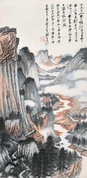 此作画的是张大千老家四川风景,四尺整张大纸,取景也很大。左侧山峦高耸,近处林木蓊郁,由近及远景色铺陈,何啻百里之遥。江水、树木、山体、屋舍各元素俱全,属于大千描绘四川景色的典型之作。