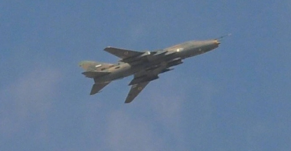 在塔布卡上空的叙利亚政府军苏22M战斗轰炸机(图为视频截图)