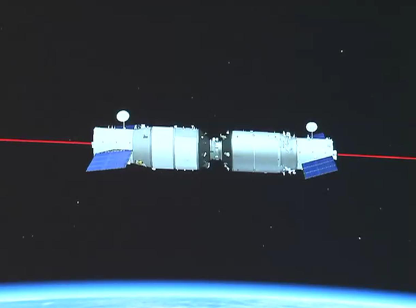 绕飞试验完成后,天舟一号与天宫二号开始第二次交会对接试验。天舟一号离开前向5千米停泊点,逐步接近至前向30米,之后与天宫二号对接机构接触,完成对接试验。(央视记者 陈勃 杨欣)