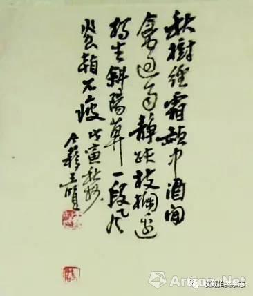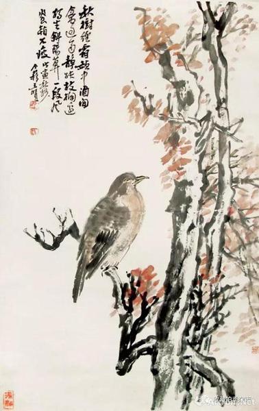 观此画,一鸟立于枯枝之上,仪态闲适,旁侧有老干三两,红叶布期间。整幅画中心在右下,故题诗于左上方,左下角大片留白,用一朱文闲章压角,整个布局疏密有致,主题突出,用色清雅,用笔老辣,树干树枝皆用草法写出,用墨多有枯湿浓淡之变化。