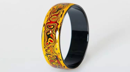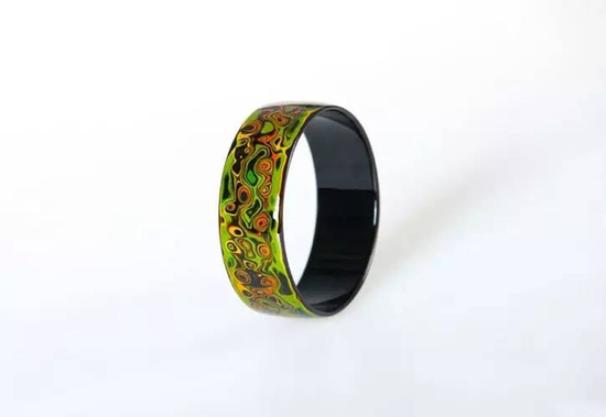 您所看到的均为王炳根先生和夫人陈小霞女士(非遗传承人)设计的手镯,颜色非常丰富微妙,绿色块里有不同层次的绿,蓝与红也如此。其中每一种色彩都需要多遍的色漆,每一只手镯都需要108道工序。