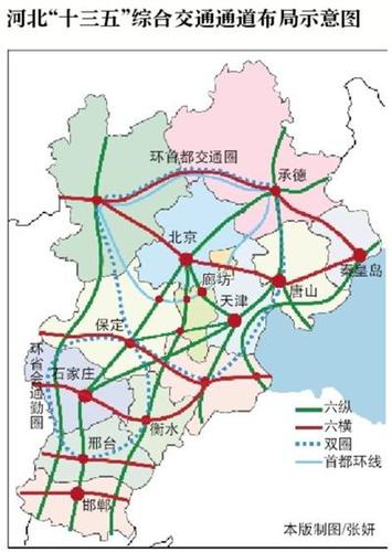 河北省“十三五”时期路网总体规划是以京津冀协同发展交通一体化“四纵四横一环”为基础,加密通道,完善环首都、环省会区域交通网,形成全省“六纵、六横、双圈”网络化综合通道布局。