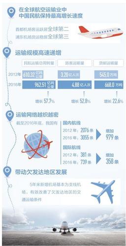 运输网络越织越密,尤其国际航班连年保持两位数增长。截至2016年底,我国各航空公司共开通国内定期航线3055条,比2012年的2076条增长47.2%,定期航班国内通航城市达到214个。国际航线增长更为迅猛,从2012年的381条增至2016年底的739条,增长94%?!耙淮宦贰毖叵吒晌屎桨嗫湃鹊?,2016年沿线航班班次量比2012年增加逾100%,目前每周定期航班4551班。