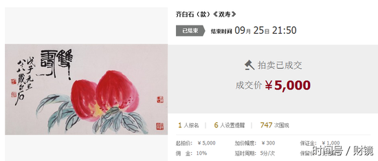 其实,这并非个例。北京时间“财镜”在京东、闲鱼、当当等平台,搜索齐白石,发现很多起拍价格在400元到1.6万元,标明是齐白石“款”或“原作”的作品,成交结果在几千块到两万之间,有的甚至附赠收藏证书。