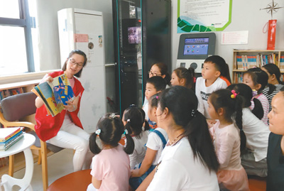 在东莱社区24小时图书馆驿站,志愿者正在为幼儿园的小朋友念绘本。