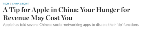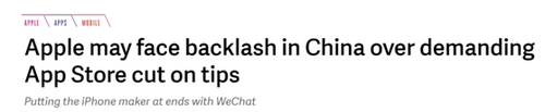 《财富》杂志也点明了苹果陷入的麻烦:《据称苹果因对中国应用收取“打赏税”陷入麻烦》。