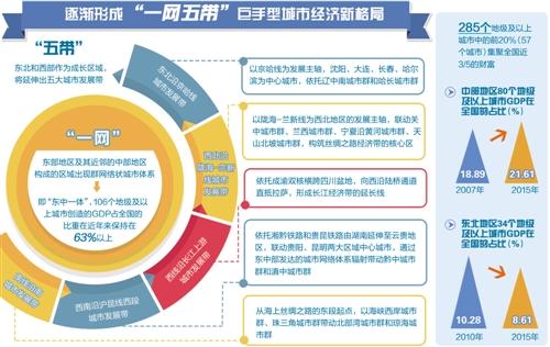 空间是人类从事经济社会活动的载体,经济客体在空间中的相互关系和布局结构便构成了空间经济。基于课题组前期的研究及判断,中国将逐渐形成以多中心网群化城市体系为支撑的“一网五带”巨手型城市中国经济空间新格局。其中,东部地区及其近邻的中部地区构成的区域将出现群网络状城市体系,聚合成“一网”,形成东中一体;东北和西部作为成长区域,将延伸出五大城市发展带(简称“五带”)。一是东北沿京哈线城市发展带,以京哈线为发展主轴,沈阳、大连、长春、哈尔滨为中心城市,依托辽中南城市群和哈长城市群。二是西北沿陇?!夹孪叱鞘蟹⒄勾?,以陇?!夹孪呶鞅钡厍姆⒄怪髦幔刂谐鞘腥?、兰西城市群、宁夏沿黄河城市群、天山北坡城市群,构筑丝绸之路经济带的核心区。三是西线沿长江上游城市发展带,依托成渝双核横跨四川盆地,向西沿陆桥通道直抵拉萨,形成长江经济带的延长线。四是西南沿沪昆线西段城市发展带,依托湘黔铁路和贵昆铁路由湖南延伸至云贵地区,联动贵阳、昆明两大区域中心城市,通过东中部发达的城市网络体系辐射带动黔中城市群和滇中城市群。五是南线沿南城市发展带,从海上丝绸之路的东段起点,以海峡西岸城市群、珠三角城市群带动北部湾城市群和琼海城市群。