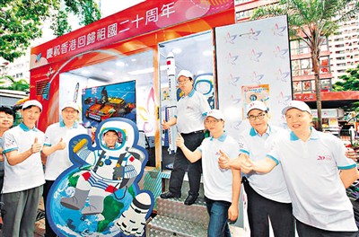 为庆祝香港回归祖国20周年,香港各界庆典委员会(庆委会)将举办多个大型庆?;疃?,其中“创科驱动·成就梦想”科技展6月29日至7月2日在维园1号至6号足球场举行。庆委会近日安排这辆以祖国航天发展为主题的宣传车,走访香港、九龙、新界等各个地区,与市民互动,让市民更清楚、深入了解科技展和各项庆祝活动的详情。