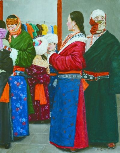 我的油画《新妆》参加了“纪念西藏和平解放60周年全国美术作品展”,画面捕捉了几位年轻的藏族母亲带着孩子们在小商店里选购服装的场面,表现了新时代西藏人民的生活状态。在构图时,我参照了在拉萨街头拍摄的照片和一些现场写生。由于原有照片中的人物组合比较松散,很难构成一幅完整的作品,我在大量的速写和照片中选取最有画意的人物形象和动态,并进行了新的构成安排,以符合画面表现的需要。在色彩方面,现实场景中母亲们的衣服原是比较灰暗、单调的色彩,难以形成富有表现力的色彩效果。为了使画面的色调更富有油画的色彩美感,我将写生中的一些人物服装色彩挪移到画面中,形成了目前更有油画意味的色彩组合。鉴于写实油画在刻画人物时必须做到具体深入,而现场写生很难做到这一点,因此在创作这件作品时,我将现场写生和照片同时展开,画面中的色彩主要依据写生,细节刻画部分则参照照片。在画面整体气氛的把握和各部分的塑造与刻画过程中,始终坚持运用传统写实油画表现的语言及技巧,以避免因被动描摹照片而导致的写实油画表现力的丧失。
