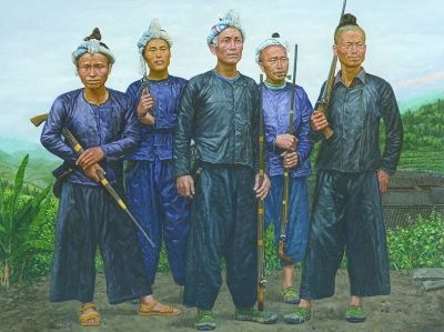《守望岜沙》是我2013年随中国美术家协会采风团赴贵州体验生活后完成的作品。此次贵州之行,我们去了黔东南的多个地方。贵州独特的自然景观、绚丽多彩的民族风情以及古老悠久的民族文化给人留下了难忘的印象。其中岜沙苗族村寨位于贵州省从江县城南6公里处月亮山麓林海中,这里的人们至今保留着佩带火枪、镰刀剃头、祭拜古树等古老的生活习俗。岜沙苗寨被誉为“阳光下最后一个枪手部落”。在大量的素材中,我最终选取了五位佩带火枪的岜沙汉子,以群像的形式加以表现。为了充分表现出当时的印象和感受,我依据现场写生和照片以及文字记录,画了若干张变体画,反复推敲人物组合关系、空间关系以及色彩关系。最终确定了以纪念碑式的构图、单纯的色调、柔和的光影效果和富有张力的造型来表现这一组群像。在绘制过程中,我力求在控制好整体画面效果的前提下,充分刻画出岜沙汉子相貌和性格上的特点。为了达到这一目的,我先参照收集的各类素材,画了单个的头像练习,仔细推敲笔、色、形、意等问题,为大画的绘制作准备。有了较为充分的前期准备工作,正式绘制时就能做到胸有成竹,进展也很顺利,基本达到了预期的目标。《守望岜沙》获第三届全国少数民族美术作品展银质奖。