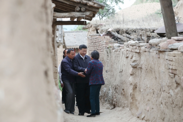 这是6月21日下午,习近平在忻州市岢岚县赵家洼村看望特困户王三女一家。新华社记者 庞兴雷 摄