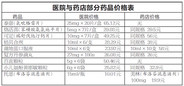 接到热线后,武汉晚报记者随即探访了汉口、东西湖和汉阳的4家药店,对比了9种药品价格,发现部分同规格的药物,药店的确比医院贵,差价最大的高达10元。