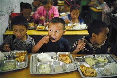 16日,勒尔小学6岁的学前班学生陈木黑在吃营养餐,餐具是学校统一配发的。