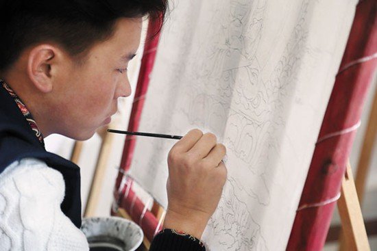 西藏职业技术学院唐卡专业一学生在进行唐卡绘画。记者王莉摄