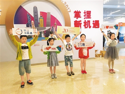 图为前来参观的小朋友们在展厅门口与庆祝香港回归20周年的标语合影。