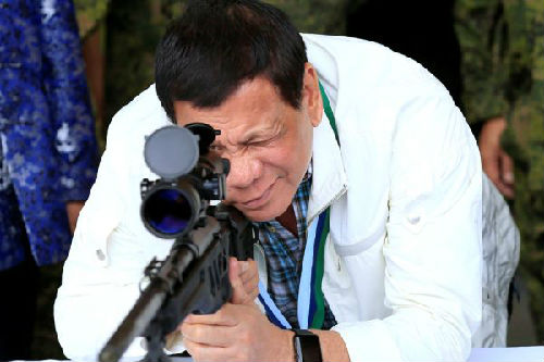 28日的交接仪式现场,杜特尔特端起一把中国产狙击步枪瞄准。