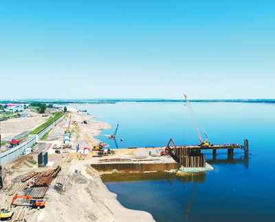 中俄首座跨界江公路大桥——中俄黑龙江大桥起点位于中国黑龙江省黑河市长发屯,终点位于俄罗斯阿穆尔州布拉戈维申斯克市卡尼库尔干村,全长19.9公里,大桥预计2019年10月通车。图为6月21日拍摄的中俄黑龙江大桥施工现场。